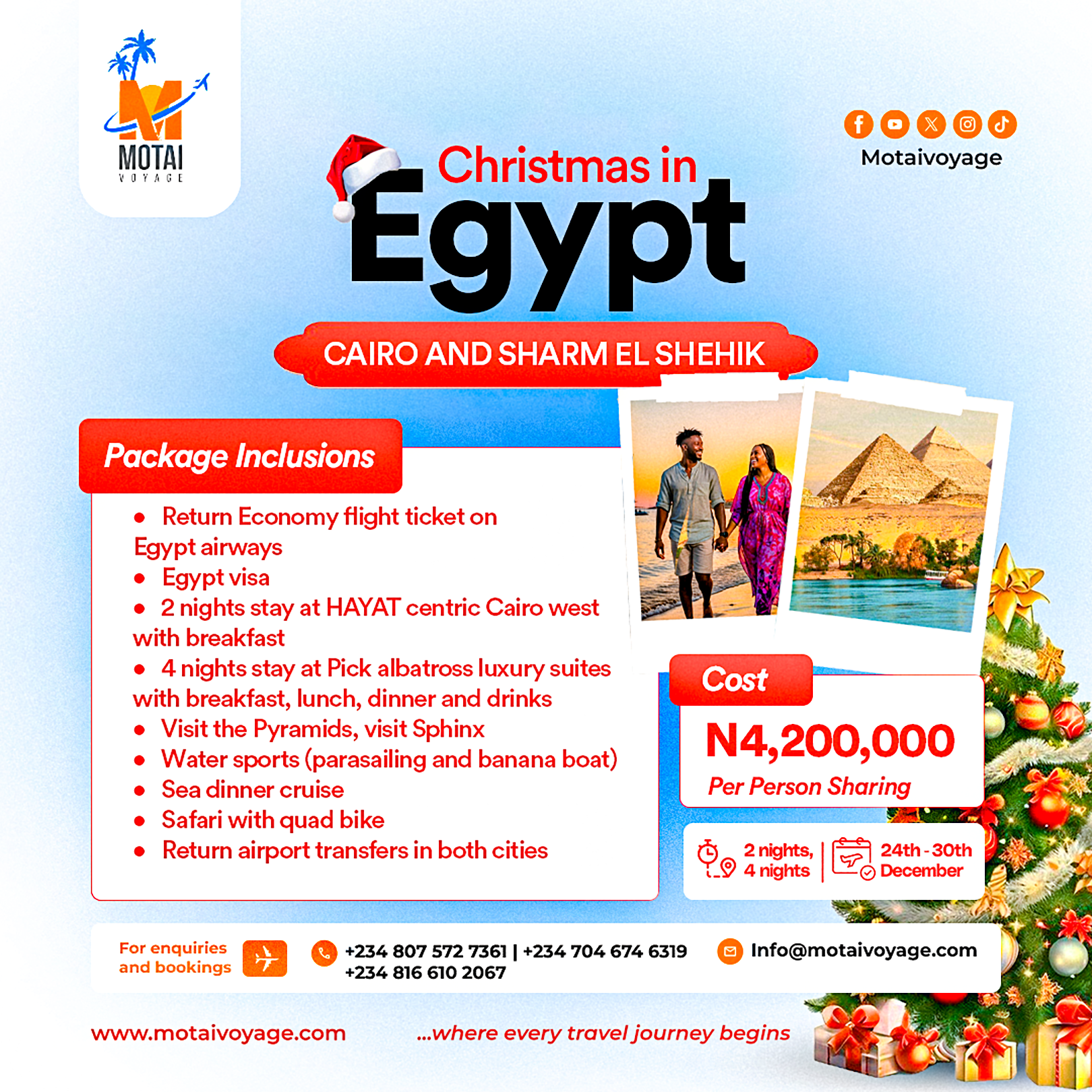 Together, Cairo and Sharm El Sheikh offer the perfect blend of tradition and excitement, making Christmas in Egypt a holiday experience like no other.